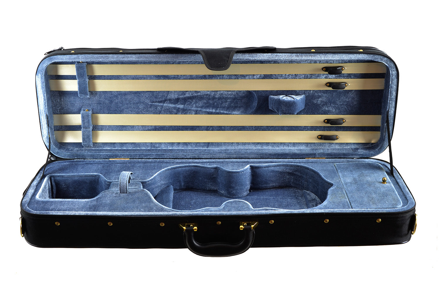 The weight of a Dart-shaped violin case with the protection and aesthetics of an deluxe case. 4 bow holders, shoulder rest pocket, full-length music pocket, accessory pocket, brass latch, full zipper closure, shoulder straps, full velour lining with matching blanket. Interior color options below, black exterior with brown piping/trim <6 lbs